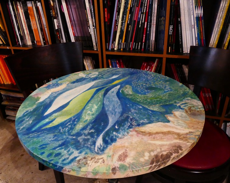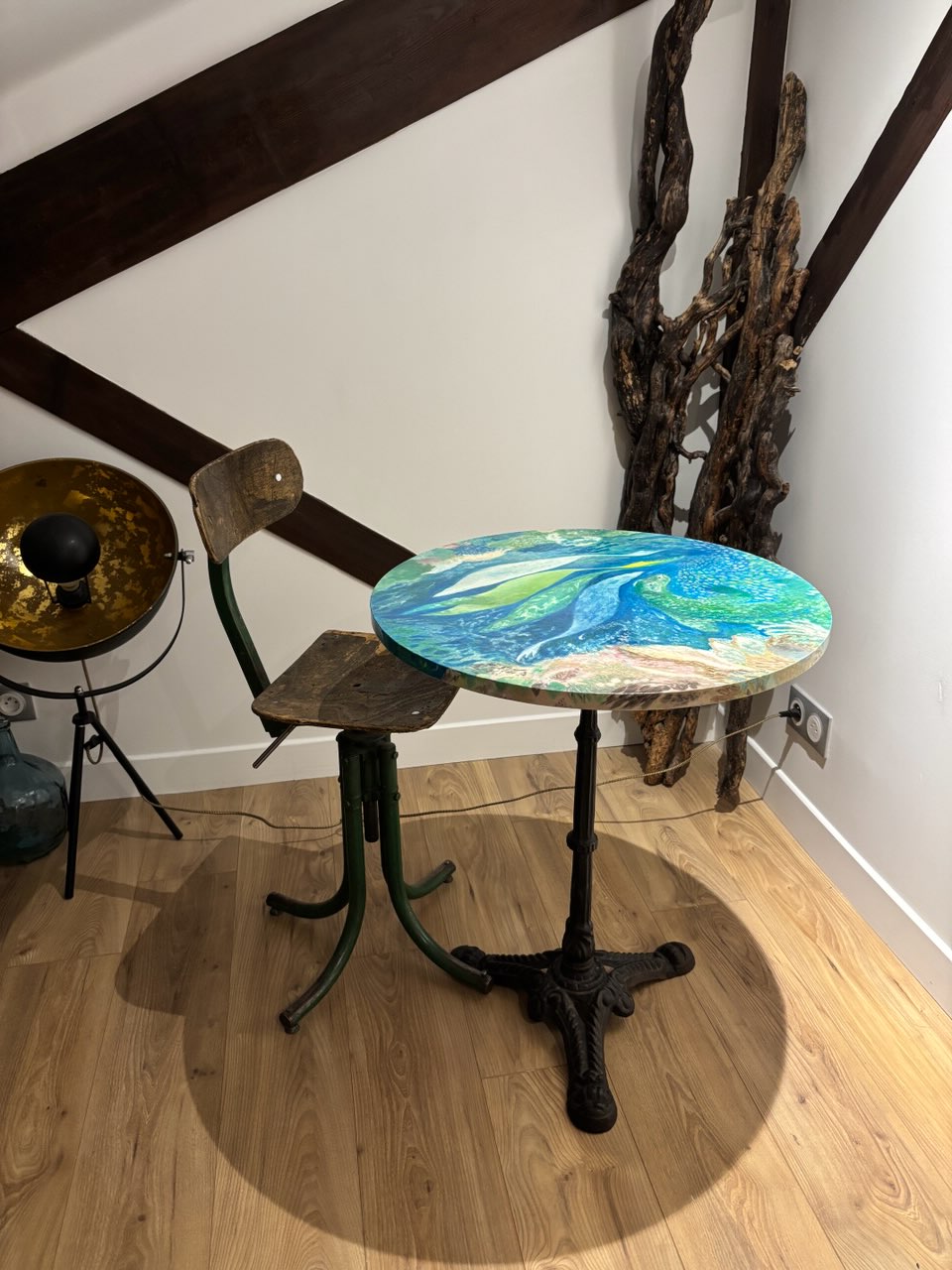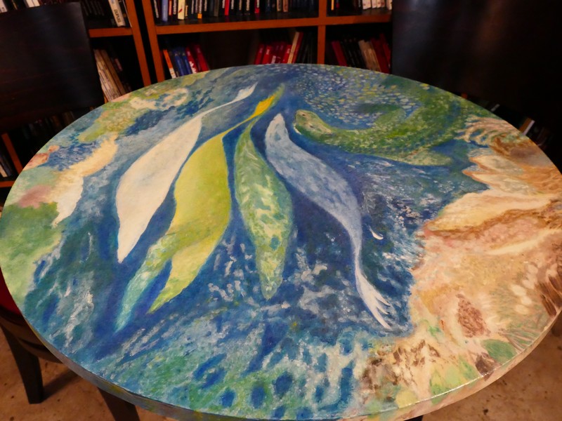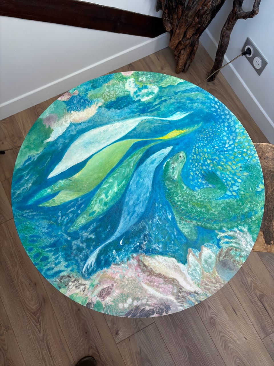 1. une magnifique œuvre d’art qui a toute sa place dans notre appartement , originale , unique , aux couleurs douces, dans un univers marin imaginaire, qui nous fait partager le monde de l’artiste avec toute sa sensibilité.
