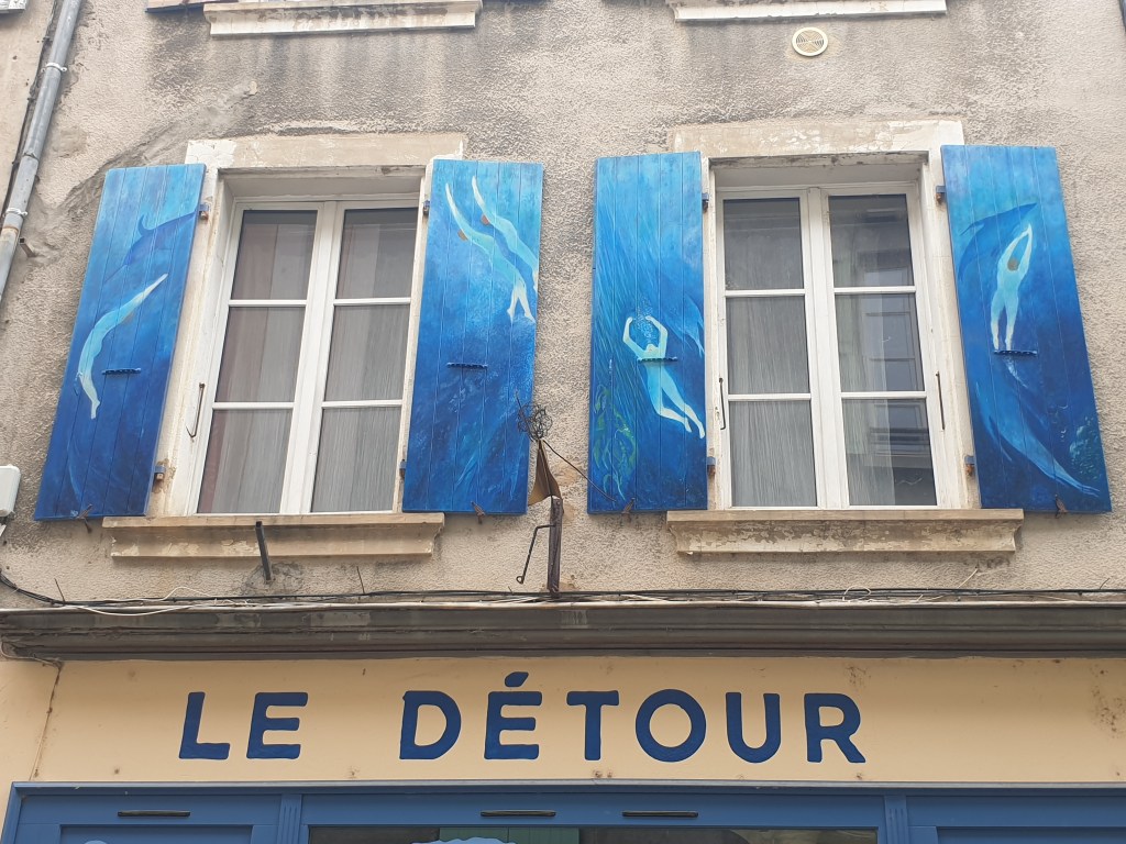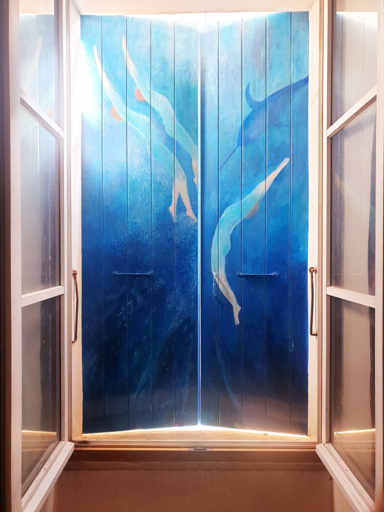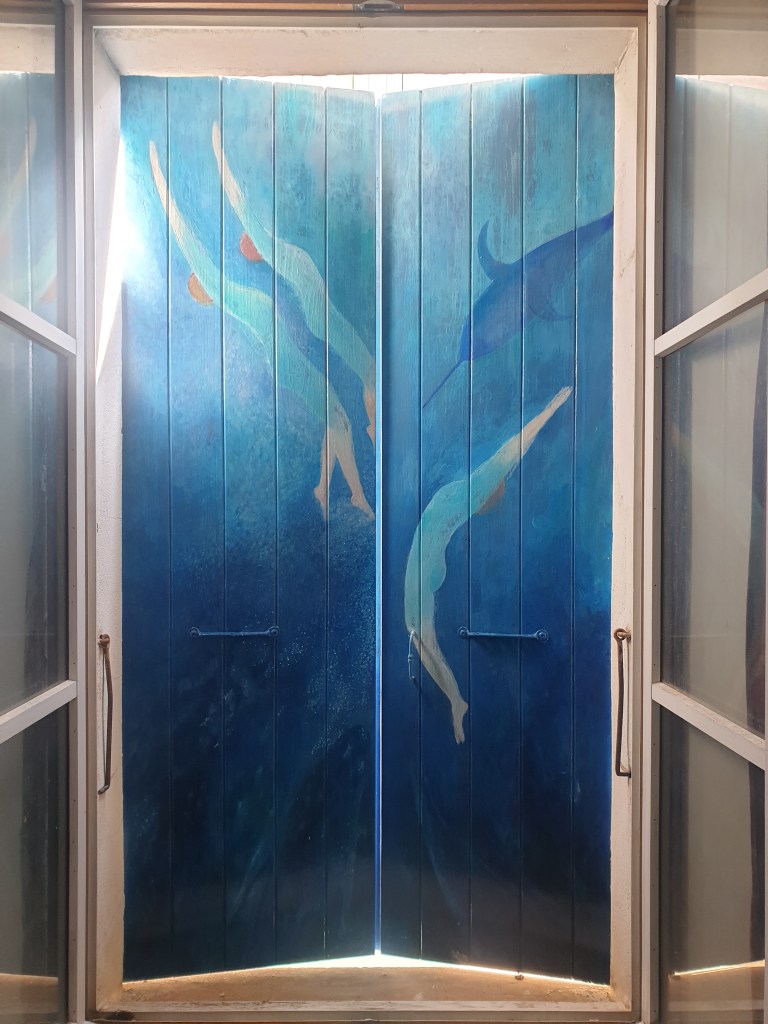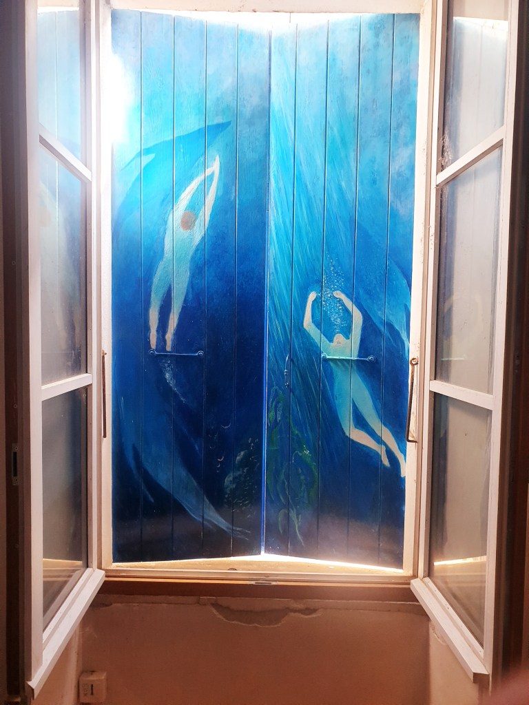 Au détour d’une rue à Crest, Des nageurs en lévitation dans l’eau, 4 panneaux de 188 x 54 cm, Mai 2025
