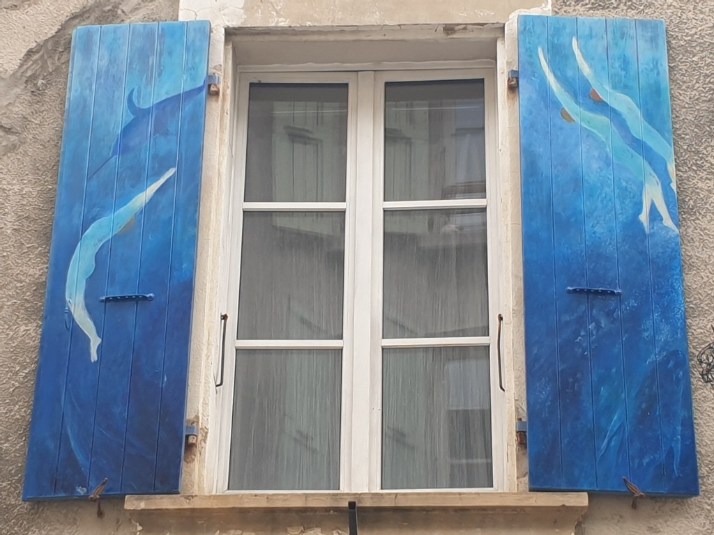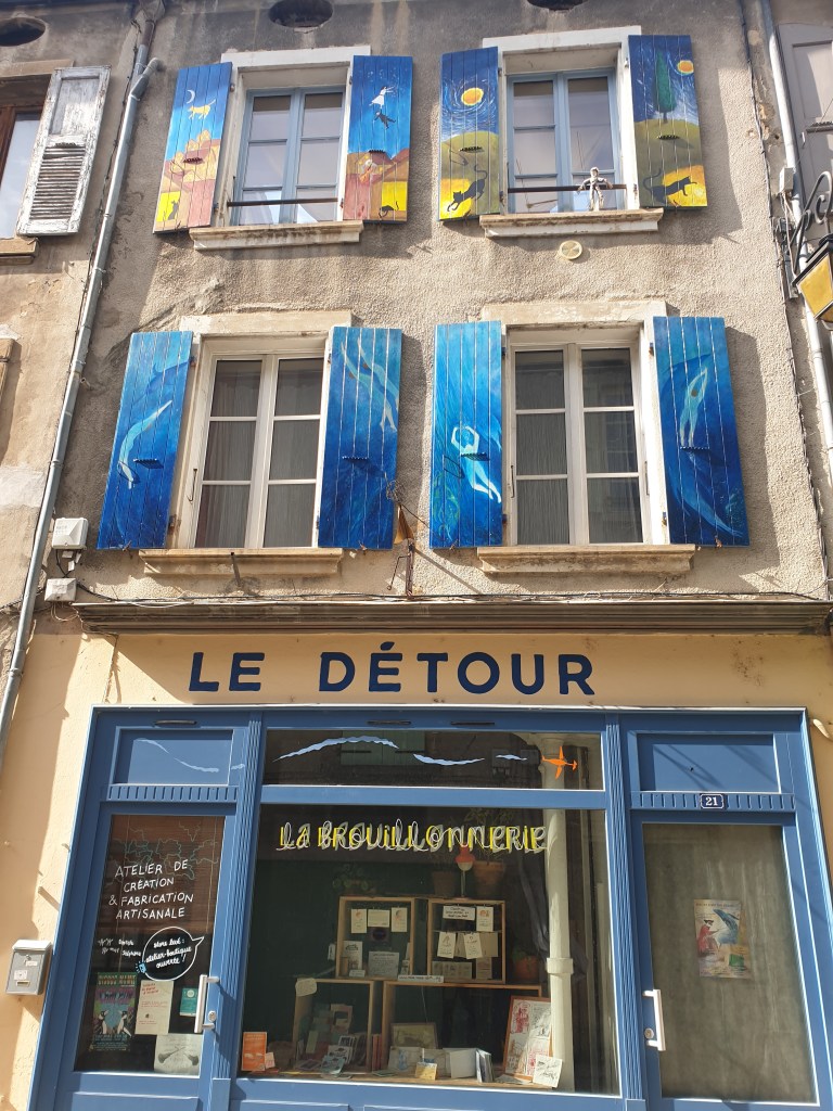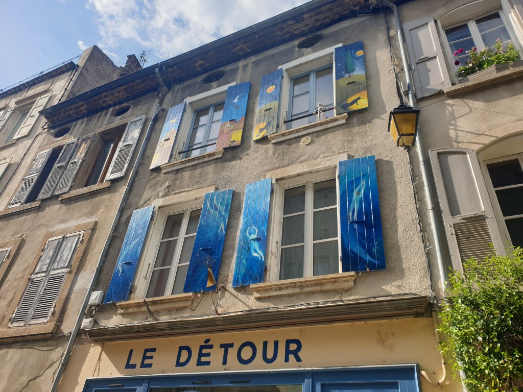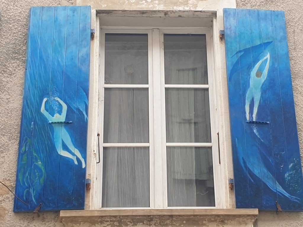 Au détour d’une rue à Crest, Des nageurs en lévitation dans l’eau, 4 panneaux de 188 x 54 cm, Mai 2025